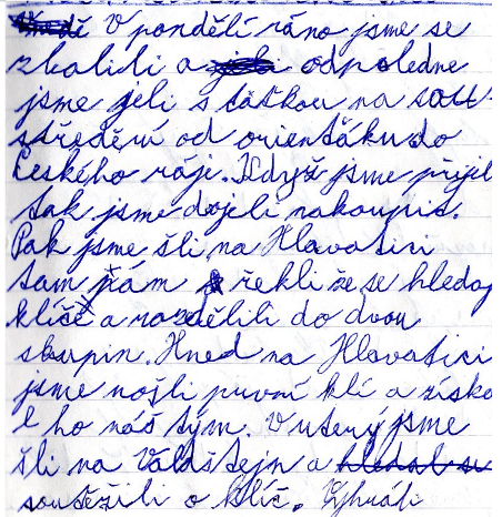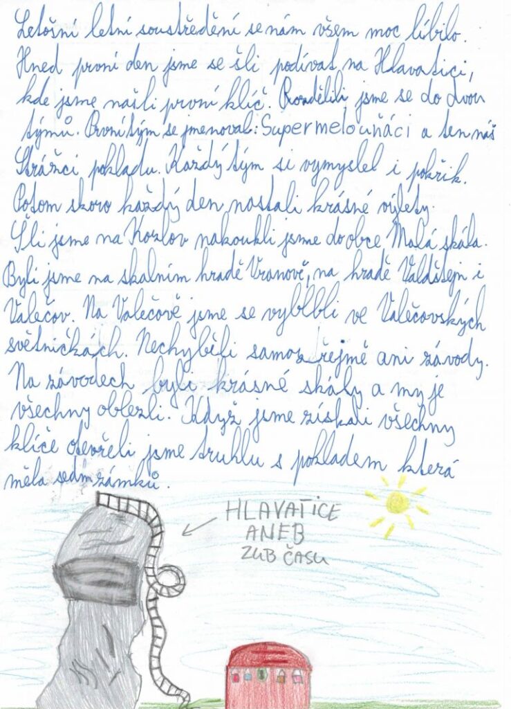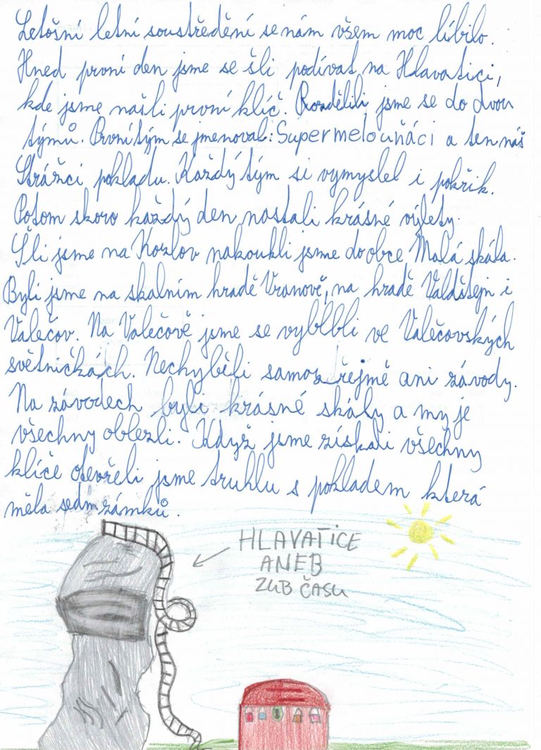 Soustředění začalo za opravdu letního počasí. Po příjezdu jsme vytvořili dvě družstva, kdy každé si vytvořilo originální jména. Supermelouňáci i Strážci pokladu, tak mohli vyrazit hledat dopisy, které jim ukáží cestu k pokladu. Dopisy dlouho skryté nezůstaly a tak podle instrukcí v nich uvedených, všichni vyrazili k Hlavatici, která nás celým soustředěním provázela, hledat první klíč.